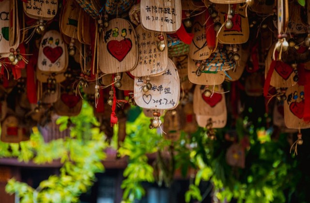 荼筱树上挂满了木制卡片