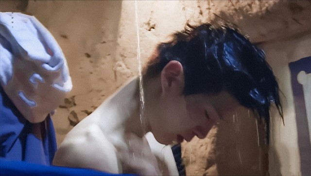 清凉的冷水顺着头像滴了下来,强硕坚硬的一身肌肉可真是养眼,以及锁骨凸起青筋的颈脖,这大帅哥