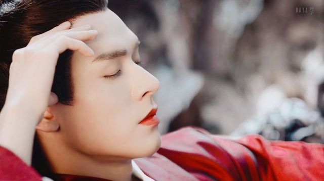 吐出一声叹息, 轻蹙玄眉的男子闭着眼,似仍在小憩,一袭红衣,仿佛鲜血浸染而成,魅极显煞。