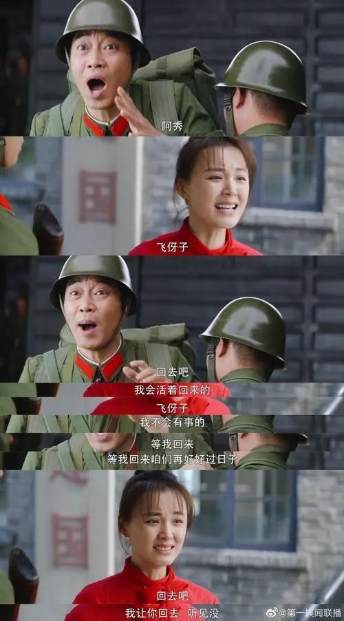 张飞强忍着悲伤大喊让阿秀回去,一次又一次的呵斥。到后来,阿秀也不再坚持,尽管是泪流满面,依然展露着笑容,代表老百姓向全体官兵深深鞠躬