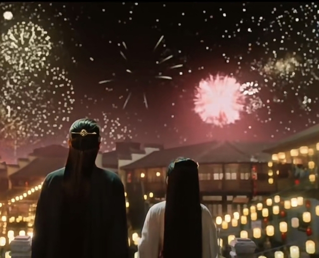 宜宁轻轻挽住你的手,温柔地引领你走到庭院之外。夜空中,绚烂的烟花一朵接一朵绽放,如同她眼中的光芒,温暖而明亮。她柔声安慰道。