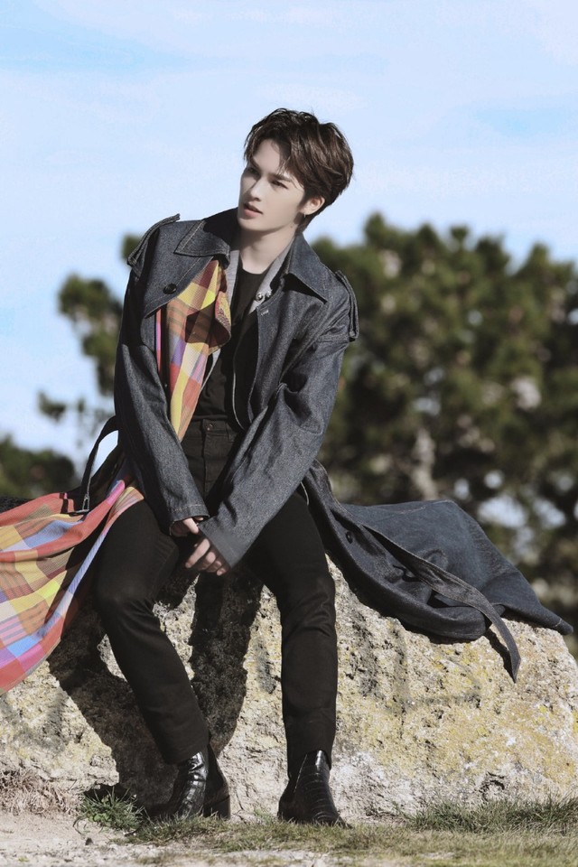 朱正廷换了一身黑色系彩格设计类的长款风衣,内搭黑色(衬衣??)下身黑色裤子,脚踩一双黑色皮鞋,头发也精心设计过,不说话,还真看不出是个0