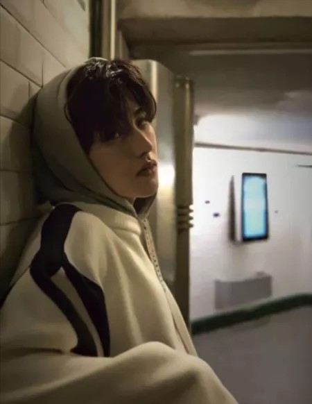 蔡徐坤靠在墙上,灯光昏暗,看不清他的表情