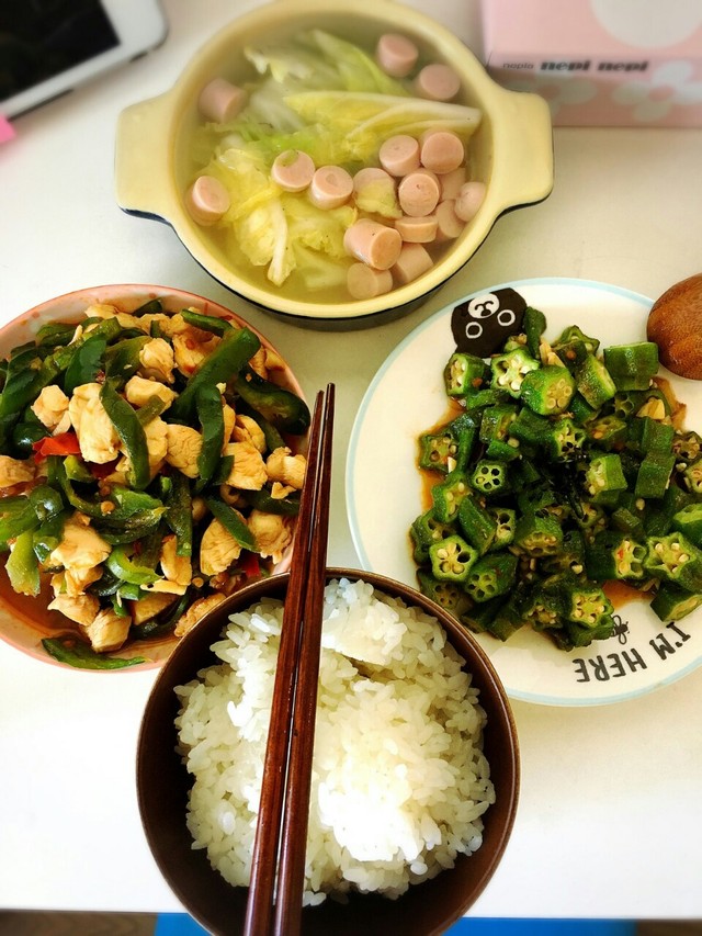 鹿晗把你第一次做坏的秋葵又拯救了一下,拿上桌子,摆好,拿了筷子给你吃饭。