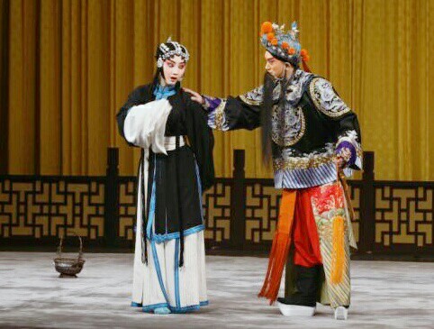 终于讲述了十八年前招亲事,寒窑门前夫妻相认,文晓歌攥着水袖,与饰演薛平贵的同学互道念白。