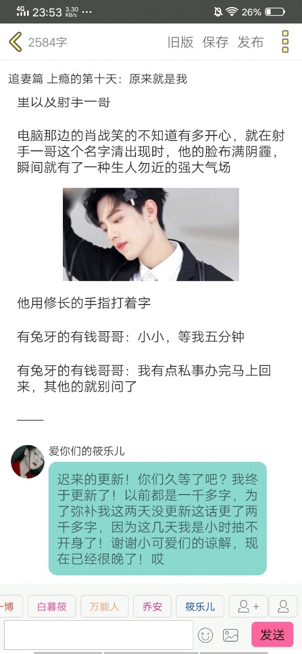 爱你们的筱乐儿迟来的更新!你们久等了吧?我终于更新了!以前都是一千多字,为了弥补我这两天没更新这话更了两千多字,因为这几天我是小时抽不开身了!谢谢小可爱们的谅解,现在已经很晚了!哎