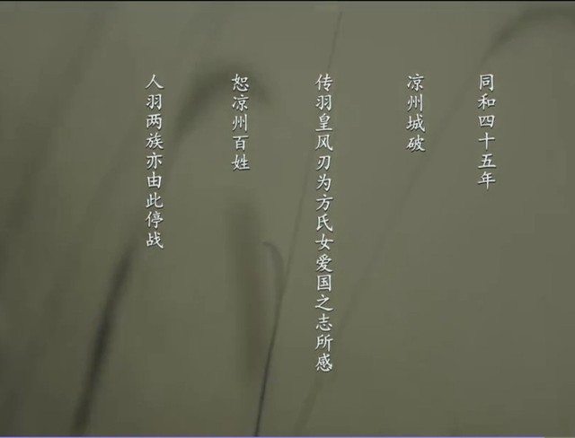 同和四十五年,凉州城破。传羽皇风刃为方氏女爱国之志所感,恕凉州百姓,人羽两族亦由此停战。