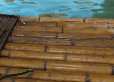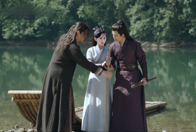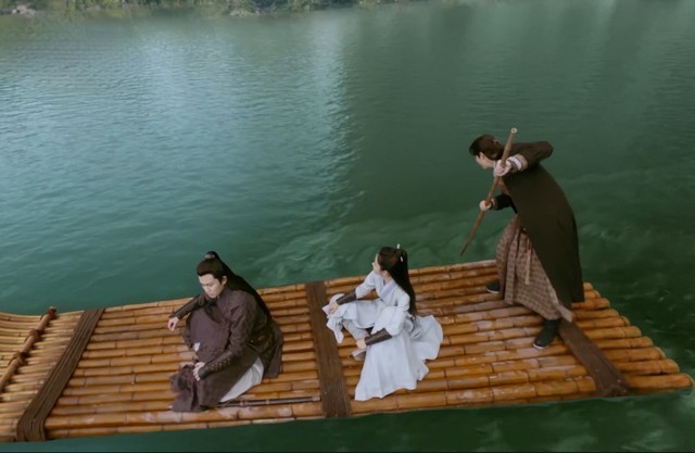 陆绎抓起腿上的一条蛇就扔下木筏,慕雪掏出手铳就对着蛇准备开枪,陆绎忙按住慕雪的手。