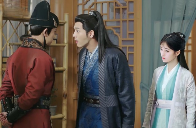 谢霄拉着陆绎就要走,陆绎一把拍开谢霄的手。谢霄指着陆绎,还不忘做一个大人生气的样子。