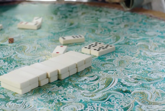 淳于家院中,慕雪带着杨岳和淳于敏在玩牌九,慕雪拿了一对牌子,然后放在桌子上。