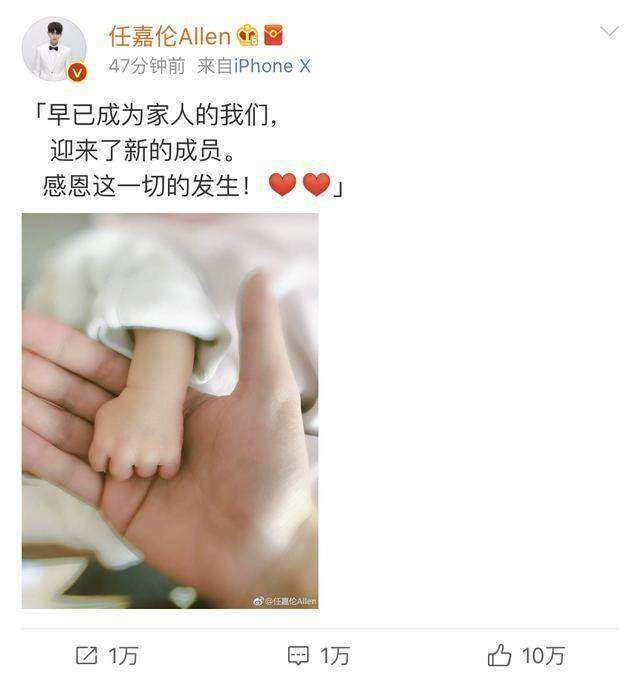 作为丈夫,任嘉伦也没有让我这个当妻子的失望,我生了孩子,他又发微博官宣当爸爸。