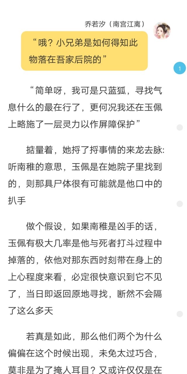 乔若汐(南宫江离)“既废了那么大心思拿到那块玉佩,为何还要故意落在我家后院?”