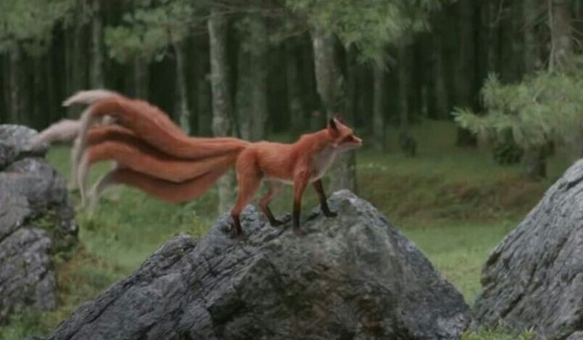 一只九尾红狐正在树林里飞快的奔跑着
