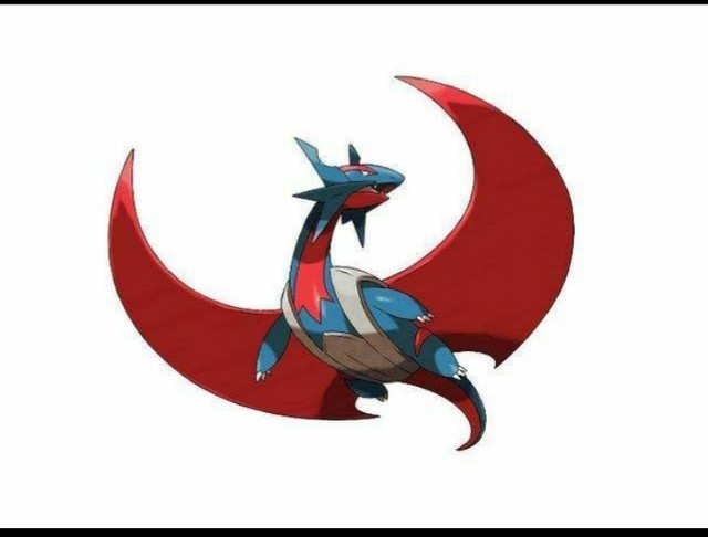 (血翼飞龙的Mega石装在它的外壳缝隙里)随着两道光链接,血翼飞龙Mega进化了。