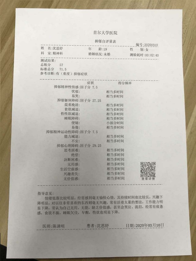 @SMTOWN:#沈思妤抑郁症#据BLACKPINK成员沈思妤所述2014年6月26日在医院查出患有中度抑郁症,今日去医院检查得知自己已经由中度变为重度,现停止目前的活动积极配合治疗。
