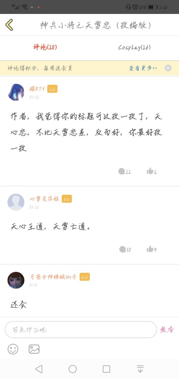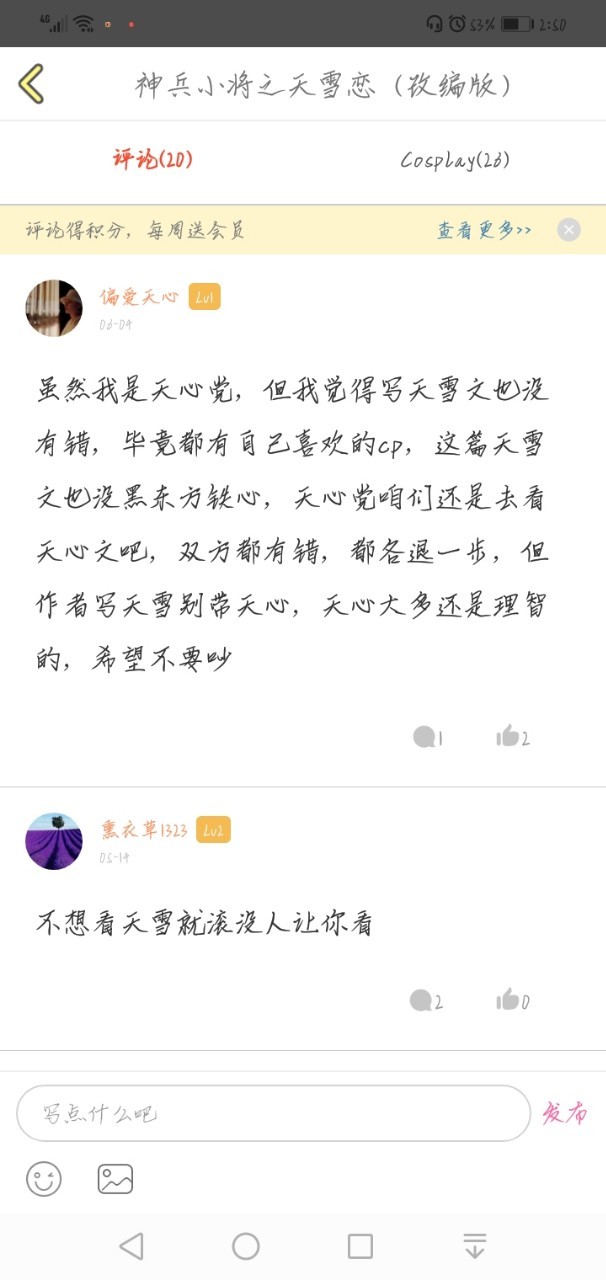 作者“不是天心别上当”我就想说了,我题目上写着“天雪恋”你是不认字吗,我只喜欢天雪,你要是不喜欢,那你别看