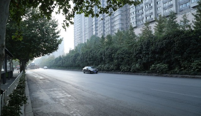 清晨,路上的行人很少,一辆黑色的车在马路上行驶,车上的人高兴的哼着歌儿。