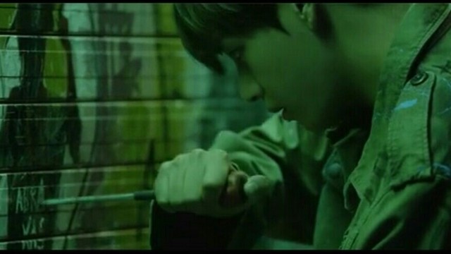 杂乱的灯光照进昏暗的巷子里,十分阴森,两个年轻男人对峙着。突然一个略为瘦弱的男人抓住了另一个男人的领子把他按到了画满涂鸦的破旧商铺门上。