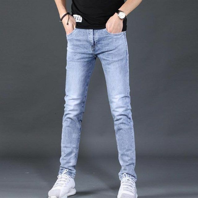 穆司宇身穿一件黑色外套和一条浅蓝色牛仔裤,脚穿一双白色运动鞋