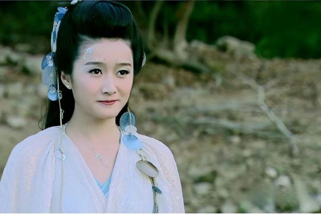 水碧穿着蓝白色的一群,头上带着蓝白色的配饰,人美得温婉的如同河水一般。