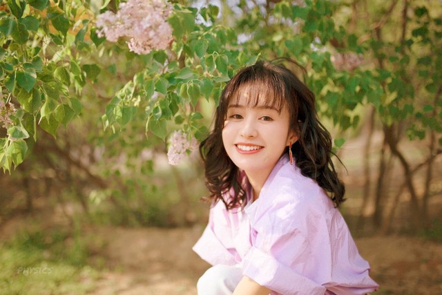 紫色花树下,半蹲着一个小女孩,她的头发偶染花香,笑容甜蜜真挚,眉眼弯弯,白皙的肌肤仿佛也在透着光亮。