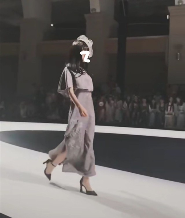 只见台上的女模特头戴白色珍珠蕾丝帽,身穿灰色淡雅连衣裙,犹如小仙女一般优雅动人,再加上她那优美的猫步,好像天生就是当模特儿的料。