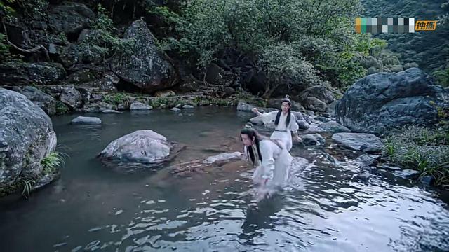 两人正玩闹着,魏无羡趁聂怀桑不注意将他踢进水中,聂怀桑扑腾着喊救命却发现站起来水连腰都没没到,张牙舞爪作势要报仇,又被魏无羡用鱼引开了注意力。
