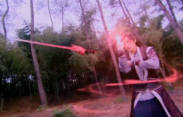 章鱼精现出原形,两只触脚绑在树上,屠苏拿着焚寂剑就冲上去。