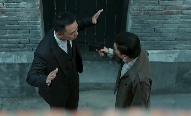 曾树一个人走在街上,陶大春则在后面悄悄地跟着他,直到曾树走到一个弄堂里,陶大春掏出腰间别着的枪,抵在曾树的背后。曾树慢慢地转过身来。