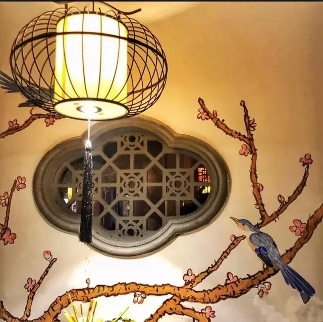 这家饭馆运用了古代装饰,显得古香古色的,墙壁上刷着赏心悦目的鸟儿鸣叫图。