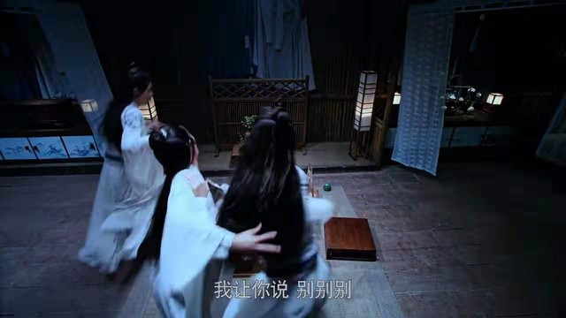 叶茯苓看着三人打闹站在一边拉也不是,于是偷偷地拿了一坛天子笑看戏。谁知三人既然打到床上去了,江晚吟把魏无羡按在床上想打他,聂怀桑在江晚吟身后拉都拉不住。
