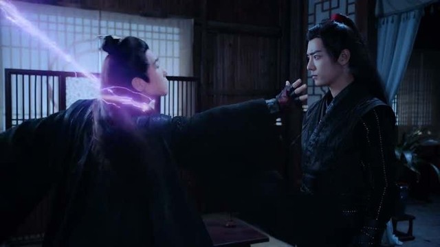 这时屋顶上的两人面色一变,蓝忘机一掌拍下打碎了瓦片,两人直接落入了驿站二楼,江晚吟趁着温逐流再次袭向魏无羡的时候用紫电绕住他的脖子,猛的一拉,翻过房梁将其吊起。