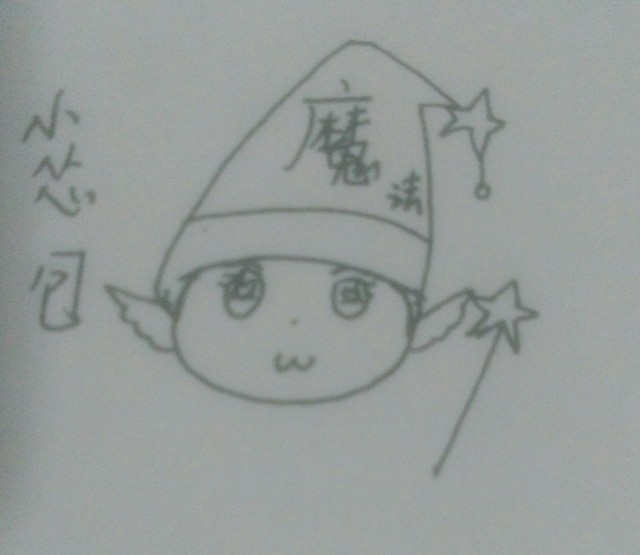 紫色的三角帽最顶端坠了颗黄色的星星,翅膀旁边漂浮着一根细细的树枝样的上面也坠了颗黄色星星的魔法棒。