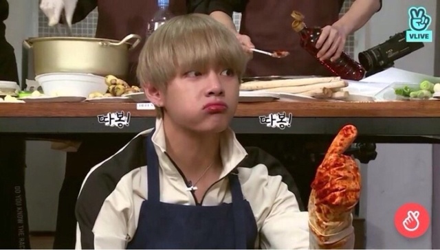 南俊,硕珍和泰亨蹲在桌前正在把弄好的辣椒酱抹在白菜上,老师过来做示范帮助混乱的三人