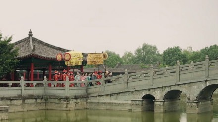 你和愉嫔跟在皇帝皇后太后的队伍身后,走在石桥上。