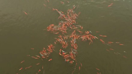 扑通一声,数条锦鲤倾入湖中,众人围在湖畔,紧盯着湖中的锦鲤看着。