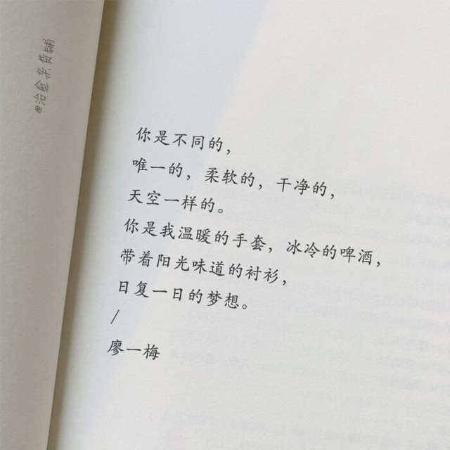 “你是不同的,唯一的,柔软的,干净的,天空一样的。你是我温暖的手套,冰冷的啤酒,带着阳光味道的衬衫,日复一日的梦想。”——廖一梅