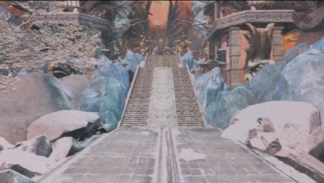 阿雷指向一旁的台阶,共有几百层的台阶,台阶上覆盖着比较厚的积雪,台阶的两旁放置着不同形状的蓝色冰晶,一旁还有小型的盘龙柱,而在台阶的最上方好像是一个大平台