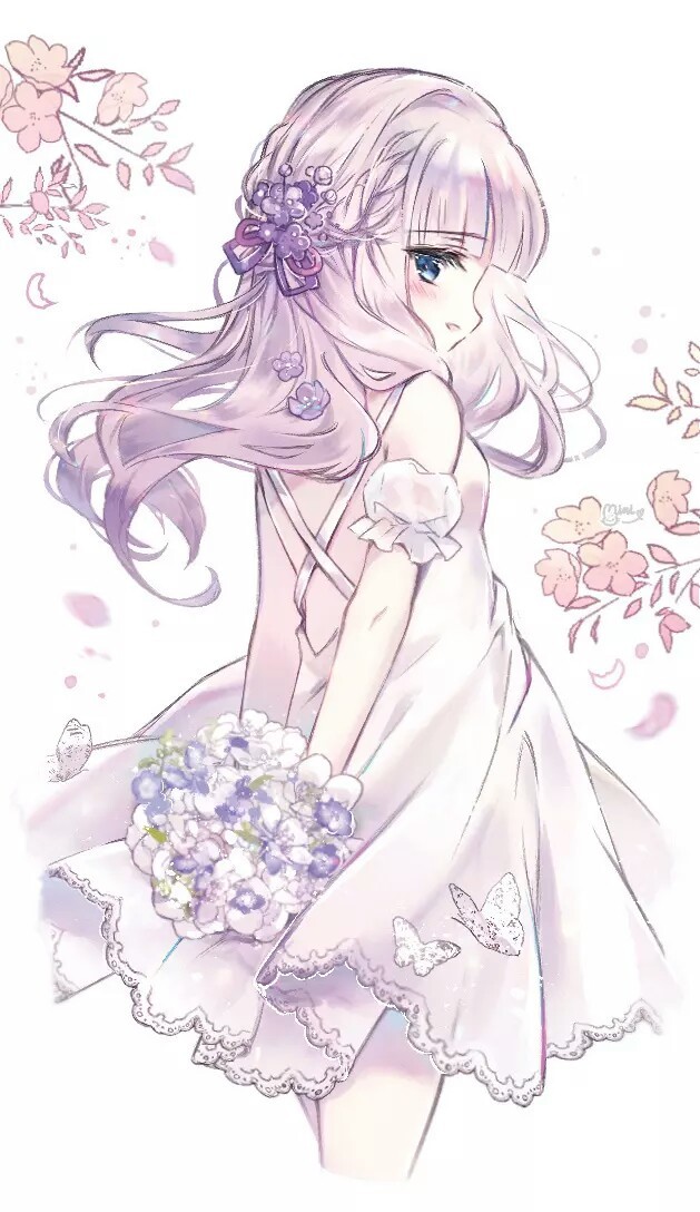 这是一个有着银色散发的女孩,鲜艳的玫红色眸子,着一件暗紫色的一字肩裙。