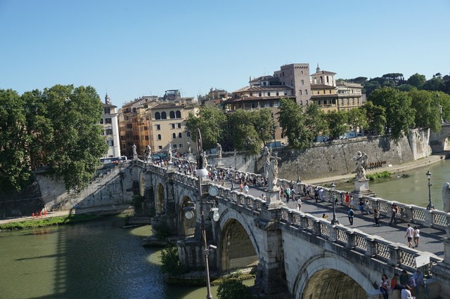 一行人下了车步行过去,途中要经过罗马最美丽的桥――圣天使桥,桥上有十二尊天使塑像,每一位天使手中都拿着一种耶稣受刑的刑具。