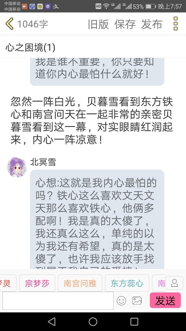 北冥雪心想:这就是我内心最怕的吗?铁心这么喜欢文天文天那么喜欢铁心,他俩多配啊!我是真的太傻了,我还真么这么,单纯的以为我还有希望,真的是太傻了,也许我应该放手找到属于我自己的爱情!