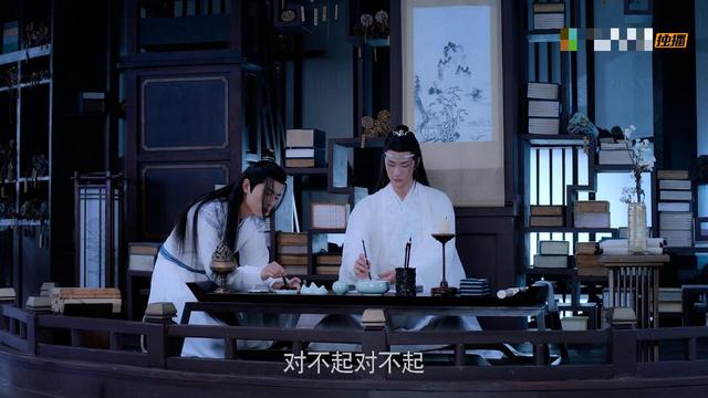 魏无羡抬手帮蓝湛研墨。