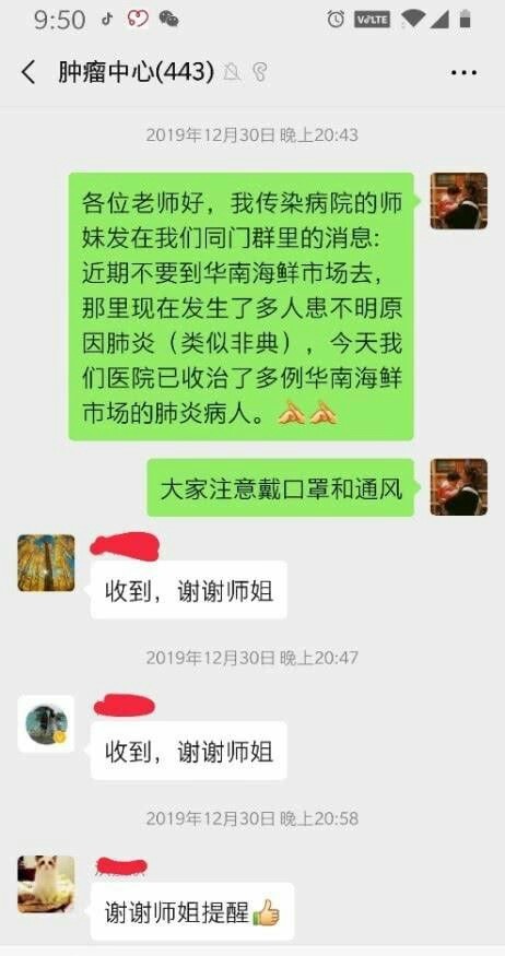 “各位老师好,我传染病院的师妹发在我们同门群里的消息:近期不要到华南海鲜市场去,那里现在发生了多人患不明原因肺炎(类似非典),今天我们医院已收治了多例华南海鲜市场的肺炎病人。大家注意戴口罩和通风。”