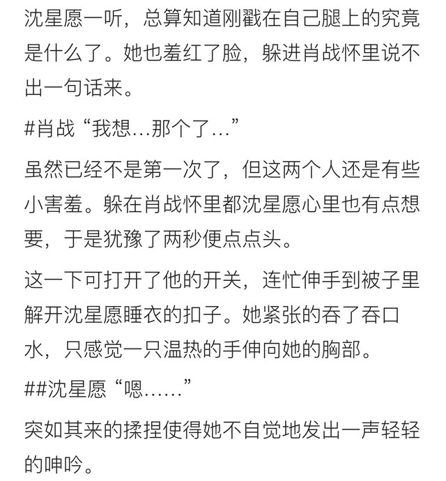 还没等沈星愿说完了话,肖战的嘴唇便贴了上去,舌尖缓缓撬开赤贝,一股薄荷香闯进她的口腔。