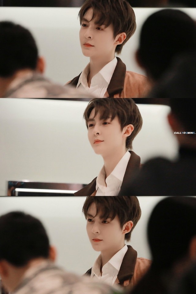 他带着微卷中分发型,穿着白色领子大红皮衣。耳垂边挂着小小圆形耳环,他属于让人惊艳到,让人想遨游他眼神里。