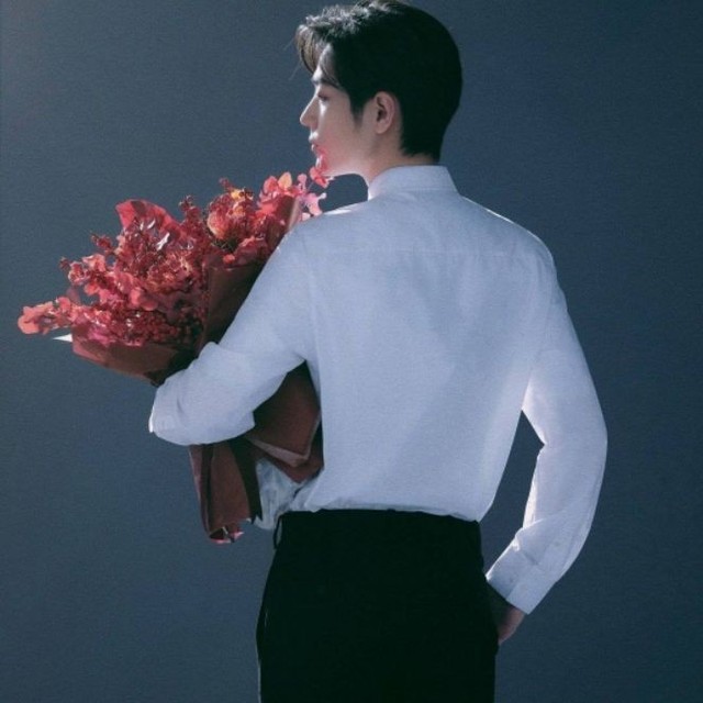 只见那人一手捧着玫瑰花,缓缓转过身来。