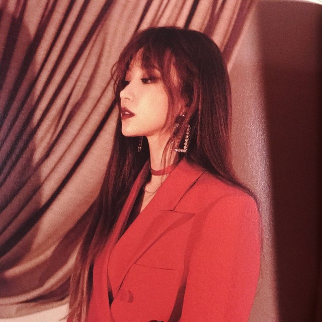 她一身红色西装西裤。