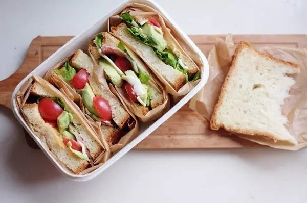 从冰箱里取了吐司,做了两个三明治放到便当盒里。