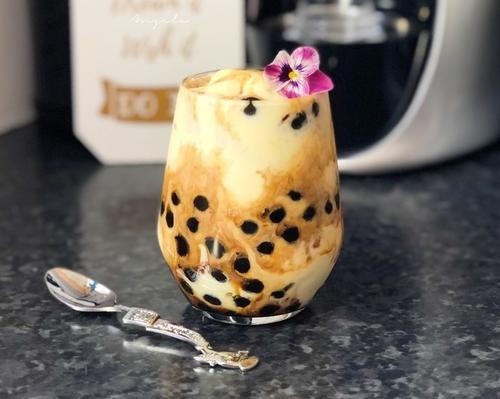 绵密的口感伴着珍珠的嚼劲在舌尖共存。黑糖和浓郁的奶香交杂蔓延。