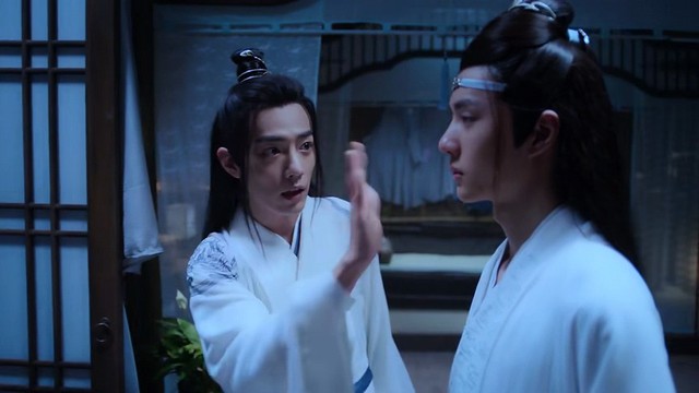 魏无羡看他一直没弄好,就想帮他,谁知几次伸手都被蓝湛打了回去。